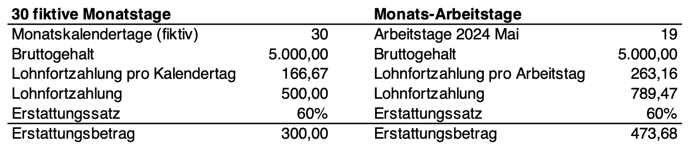 Allein für das fortgezahlte Bruttogehalt hätten Sie mit der Berechnung nach Arbeitstagen eine um 173,68 EUR höhre Erstattung.